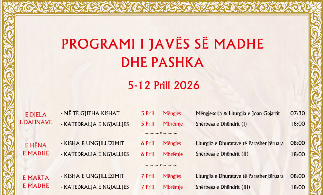 E Enjtja e Madhe: Mëngjesorja dhe Mbrëmësorja e ndërthurur me Liturgjinë Hyjnore të Shën Vasilit të Madh, e drejtuar nga Fortlumturia e Tij, Joani, Kryepiskop i Tiranës, Durrësit dhe i Gjithë Shqipërisë. Katedralja “Ngjallja e Krishtit”, Tiranë 9 prill 2026 GalleryE Enjtja e Madhe: Mëngjesorja dhe Mbrëmësorja e ndërthurur me Liturgjinë Hyjnore të Shën Vasilit të Madh, e drejtuar nga Fortlumturia e Tij, Joani, Kryepiskop i Tiranës, Durrësit dhe i Gjithë Shqipërisë. Katedralja “Ngjallja e Krishtit”, Tiranë 9 prill 2026
