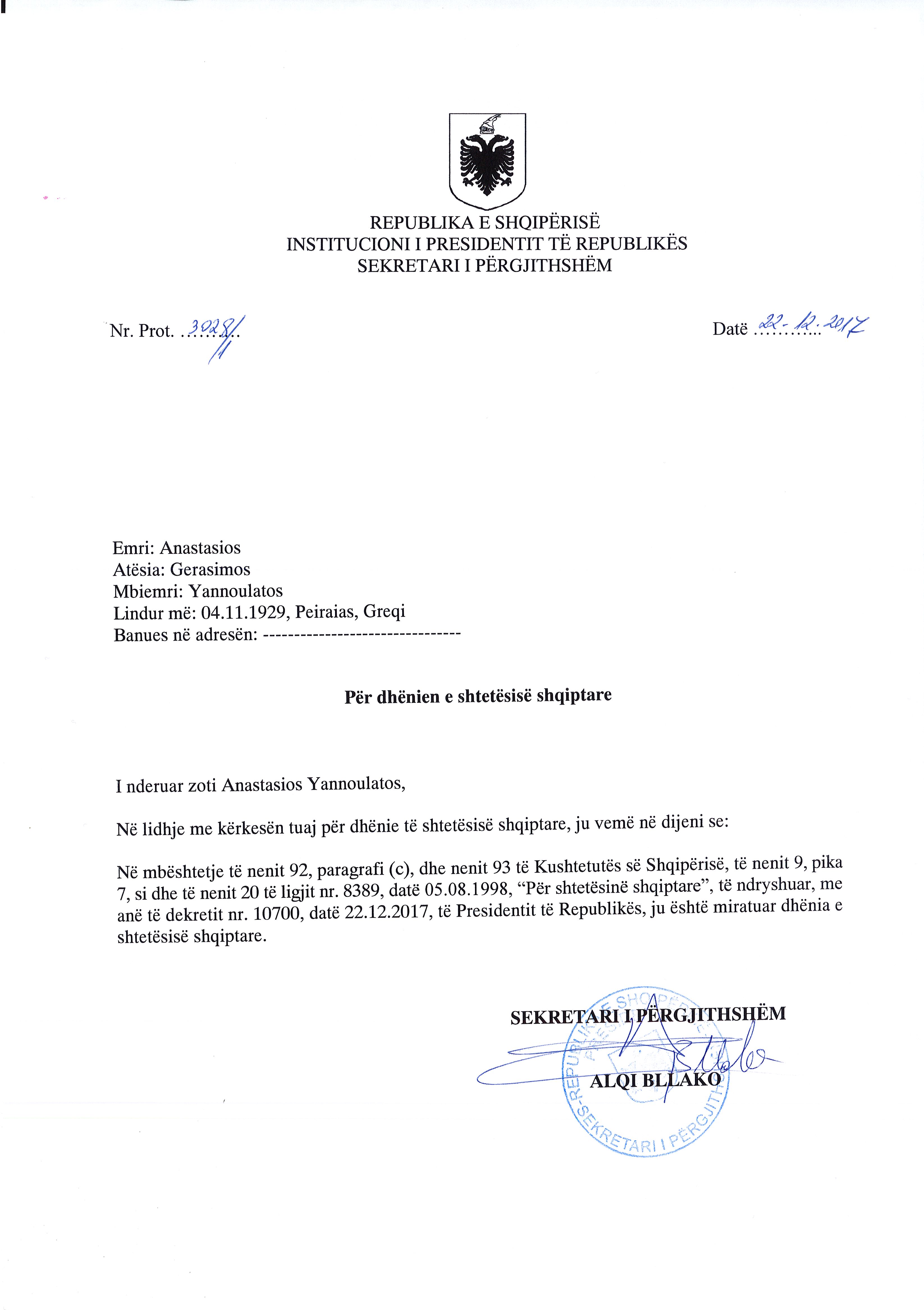 In a letter delivered on December 24th 2017, His Excellency Mr. Ilir Meta, President of the Republic of Albania, offered his heartfelt congratulations to His Beatitude Archbishop Anastasios of Tirana, Durrës and all Albania who was granted Albanian citizenship by presidential decree no. 10700/22.12.2017.